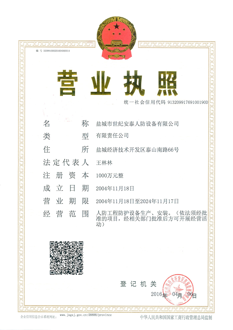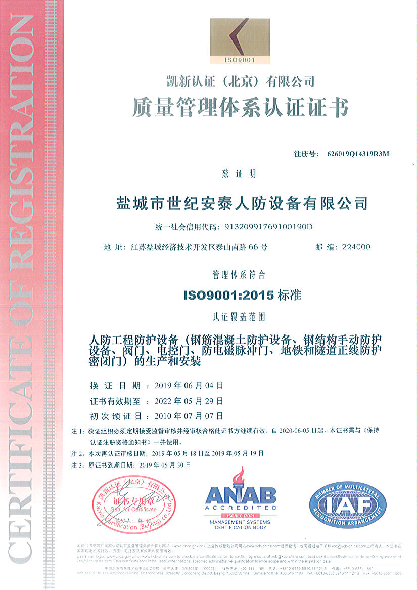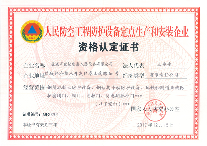 鹽城市世紀(jì)安泰人防設(shè)備有限公司是國(guó)家人民防空辦公室批準(zhǔn)成立的人防工程防護(hù)設(shè)備定點(diǎn)生產(chǎn)和安裝企業(yè),是專業(yè)生產(chǎn)、銷售、安裝人防防護(hù)設(shè)備產(chǎn)品的企業(yè),公司主要生產(chǎn)鋼筋混凝土防護(hù)設(shè)備、鋼結(jié)構(gòu)手動(dòng)防護(hù)設(shè)備、閥門、電控門、防電磁脈沖門、地鐵和隧道正線防護(hù)密閉門等各類產(chǎn)品并對(duì)產(chǎn)品進(jìn)行安裝、調(diào)試、維修及保養(yǎng),公司生產(chǎn)的各種規(guī)格的人防工程產(chǎn)品,均按國(guó)家人防總參工程兵四所及中國(guó)建筑標(biāo)準(zhǔn)設(shè)計(jì)研究院提供的圖紙生產(chǎn),符合各種人防工程設(shè)計(jì)要求,是各類地下人防工程選用的理想產(chǎn)品。本公司已通過(guò)GB/T19001-2008IDT ISO9001:2008國(guó)家質(zhì)量體系認(rèn)證。
